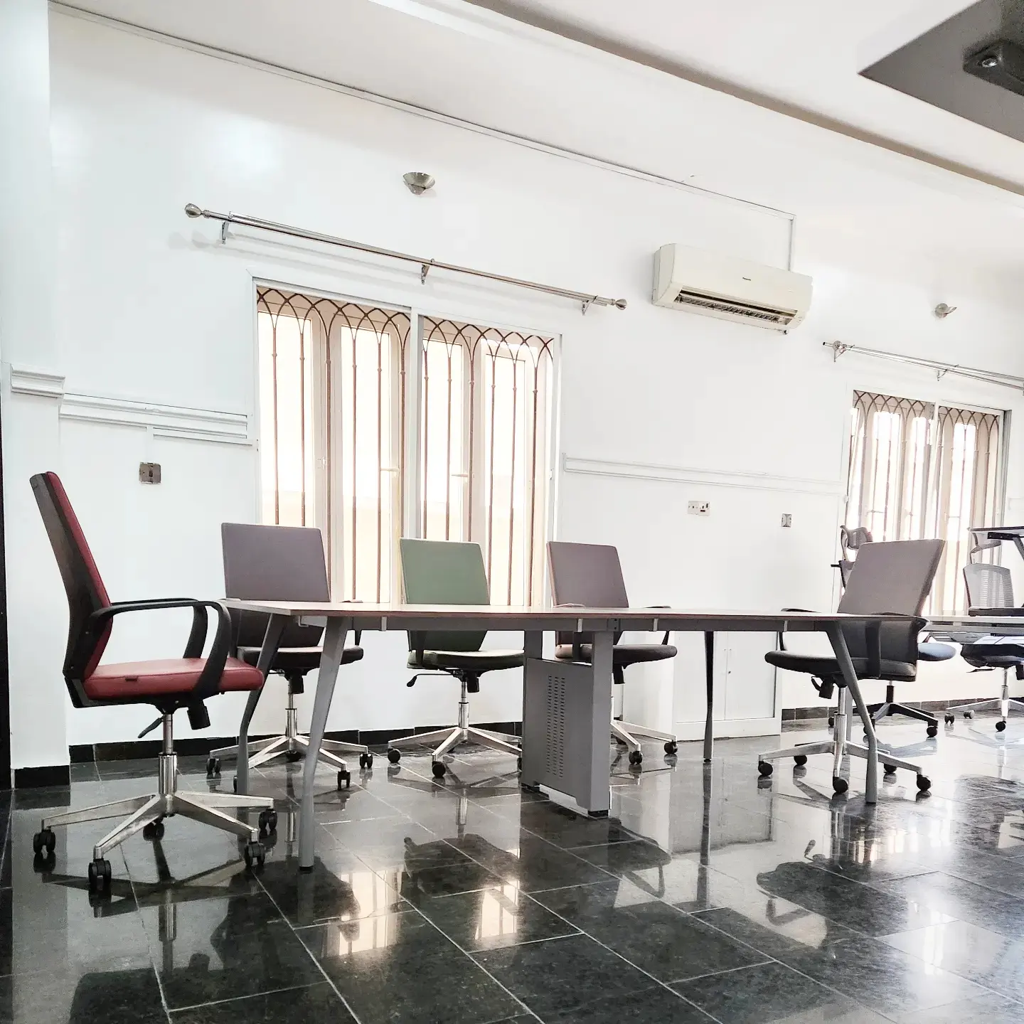 - INCLUDES 4 DESKS, 4 MOBILE PEDESTALS & 2 SCREENS